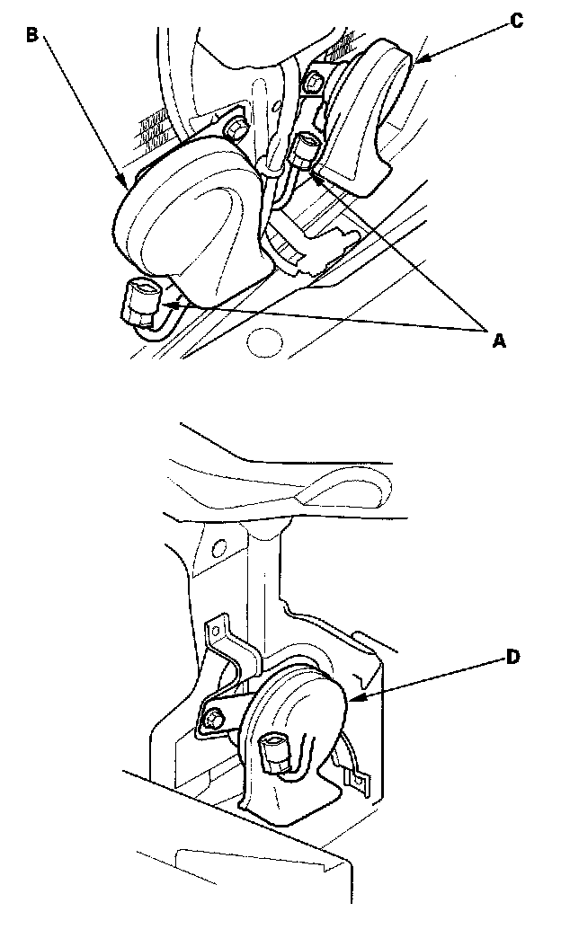 4. Disconnect the 1P connector (A), and remove the low horn (B) and high horn (C) ('99 model) or (D) ('00-03 models).