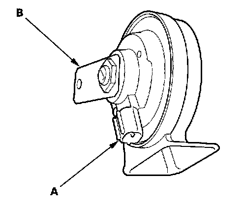 5. Test the horn by connecting battery power to the terminal (A) and grounding the bracket (B). The horn should sound.