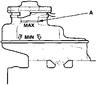 1. Make sure the brake fluid level in the reservoir is at the MAX (upper) level line (A).