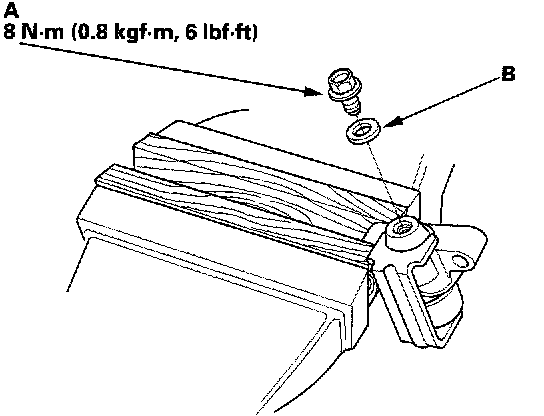 9. Reinstall the maintenance bolt (A). Always use a new casket (B) ('99 model).