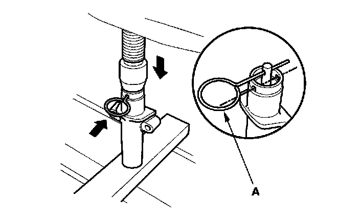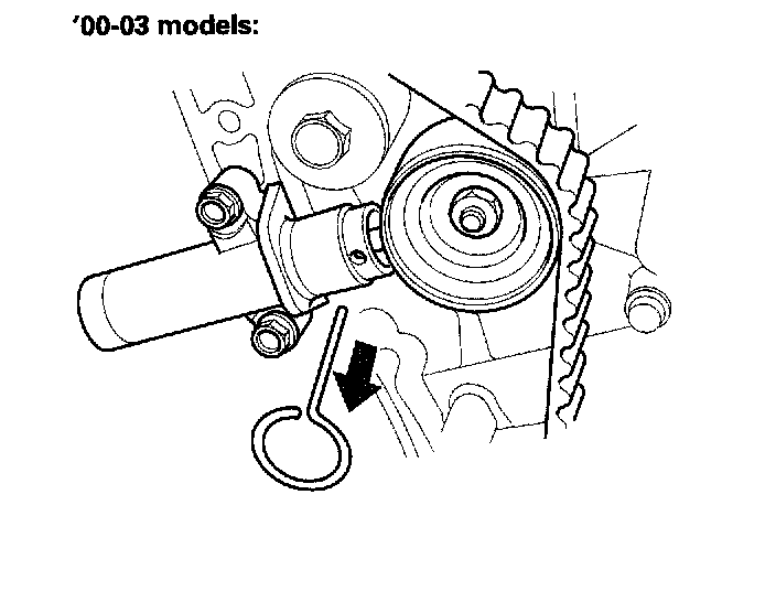 11. Align the holes on the rod and housing of the autotensioner with a pin (A)('00-03 models).