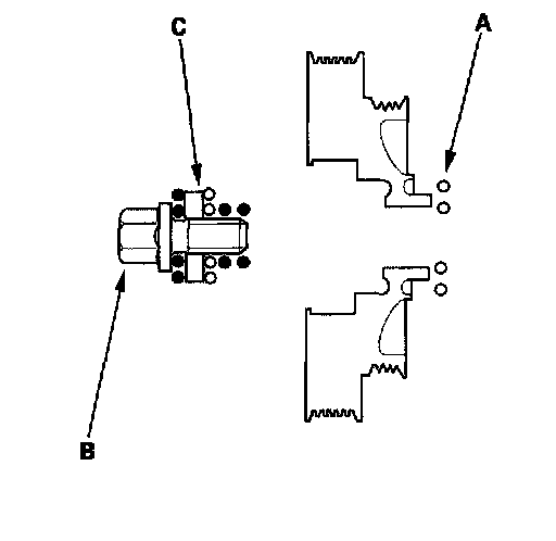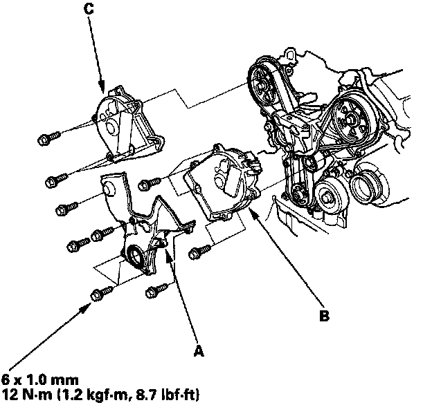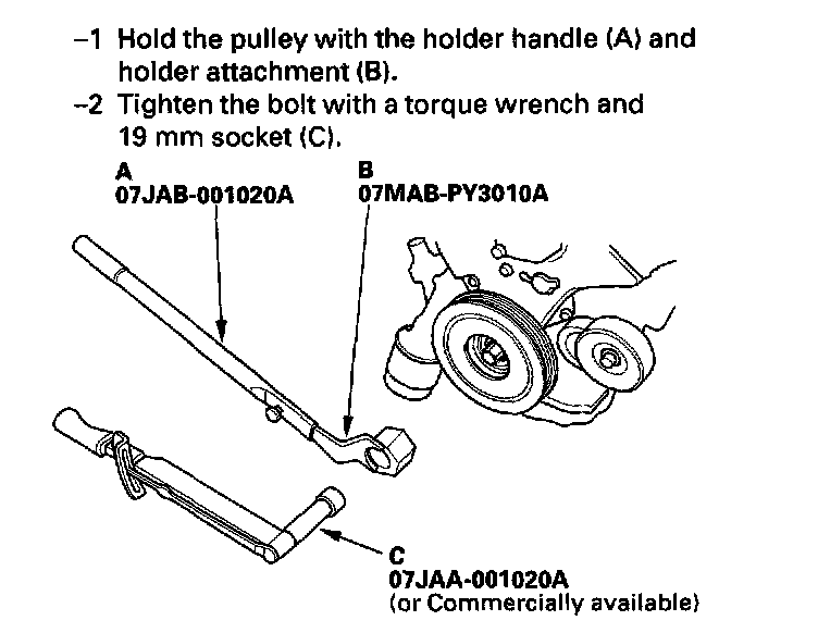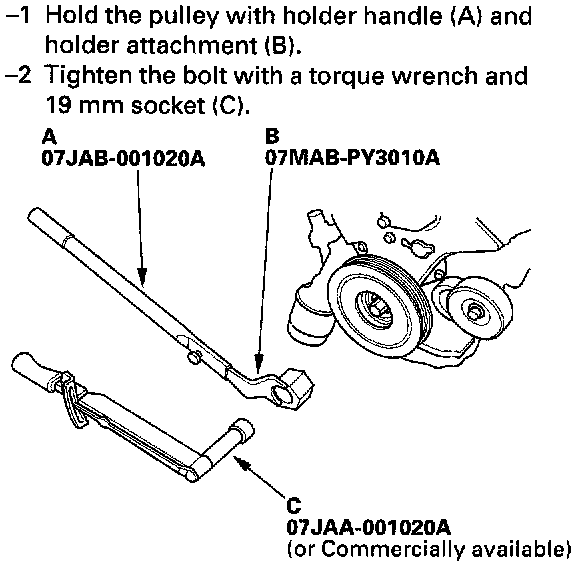 20. Clean all oil off the inside face (A) of the crankshaft pulley, and apply lubricant to the pulley bolt (B) and washer (C).