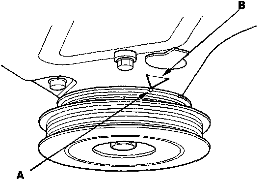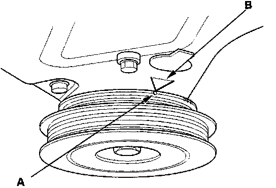 14. Turn the crankshaft pulley so its white mark (A) lines up with the pointer (B).