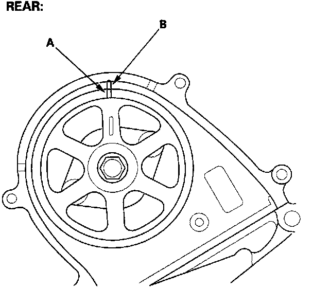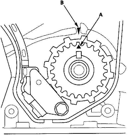 2. Set the timing belt drive pulley to Top Dead Center (TDC) by aligning the TDC mark (A) on the tooth of the timing belt drive pulley with the pointer (B) on the pulley.