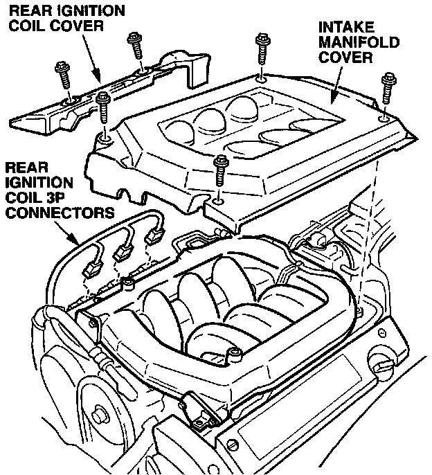 1. Remove the intake manifold cover. Unplug the ignition coil 3P connectors on the rear bank, then remove the rear ignition coil cover.