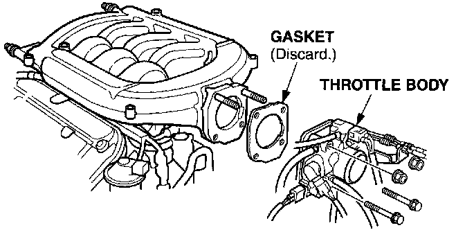 3. Remove the throttle body from the intake manifold (two nuts and two bolts). Leave all hoses, cables, and electrical connectors connected to the throttle body. Discard the throttle body gasket.