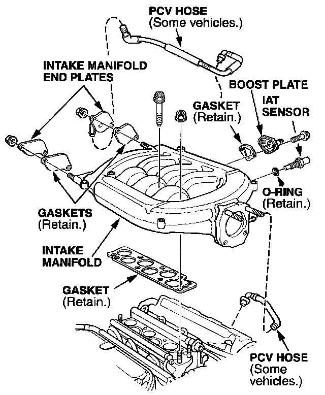 5. Remove the end plates, IAT sensor, and boost plate from the intake manifold. If the PCV hose connects to the intake manifold instead of the end plate, remove the hose.