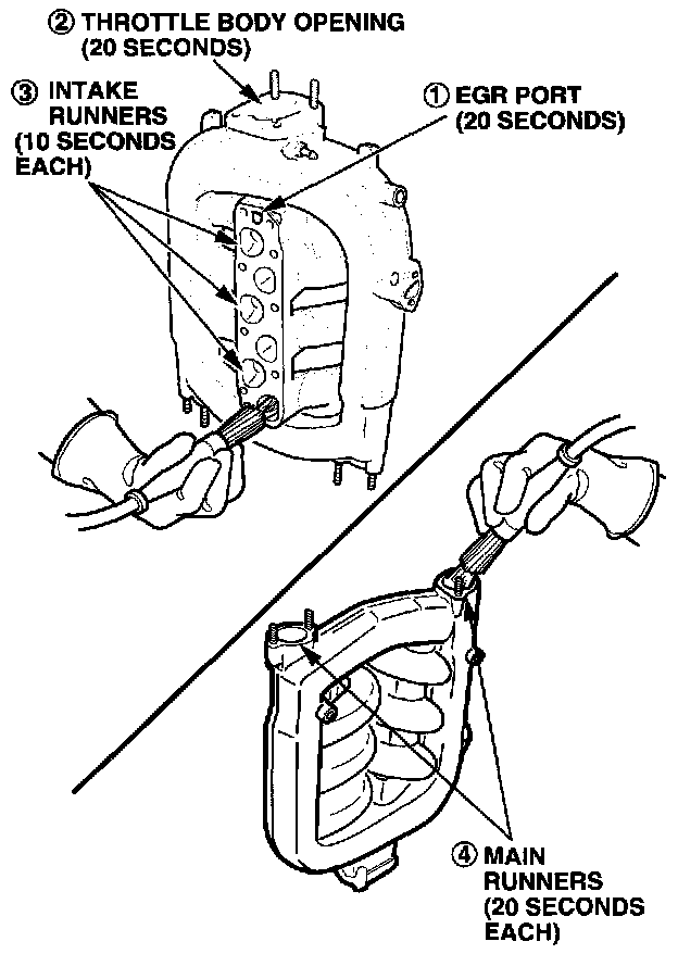 ^ Flush each intake runner for 10 seconds. Start at the throttle body end and work toward the back.