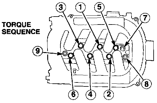 18. Install the intake manifold with the original gasket. Torque the mounting nuts and bolts to 22 N.m (16 lb-ft) sequentially in two or three steps. Route the PCV hose so it is not pinched under the intake manifold.
