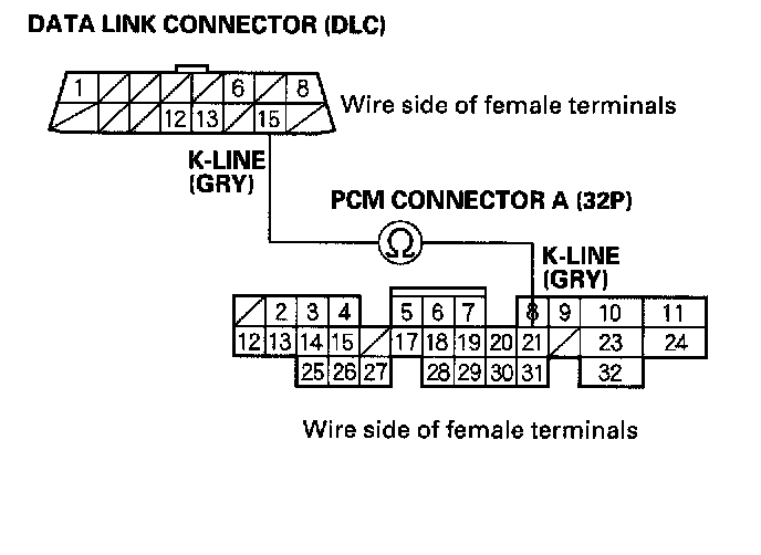 NO - Repair open in the wire between DLC terminal No.15 and the PCM (A21). After repairing the wire, check the DTC with the OBD II scan tool/Honda PGM Tester, and go to the DTC Troubleshooting Index. Diagnostic Trouble Code Descriptions
