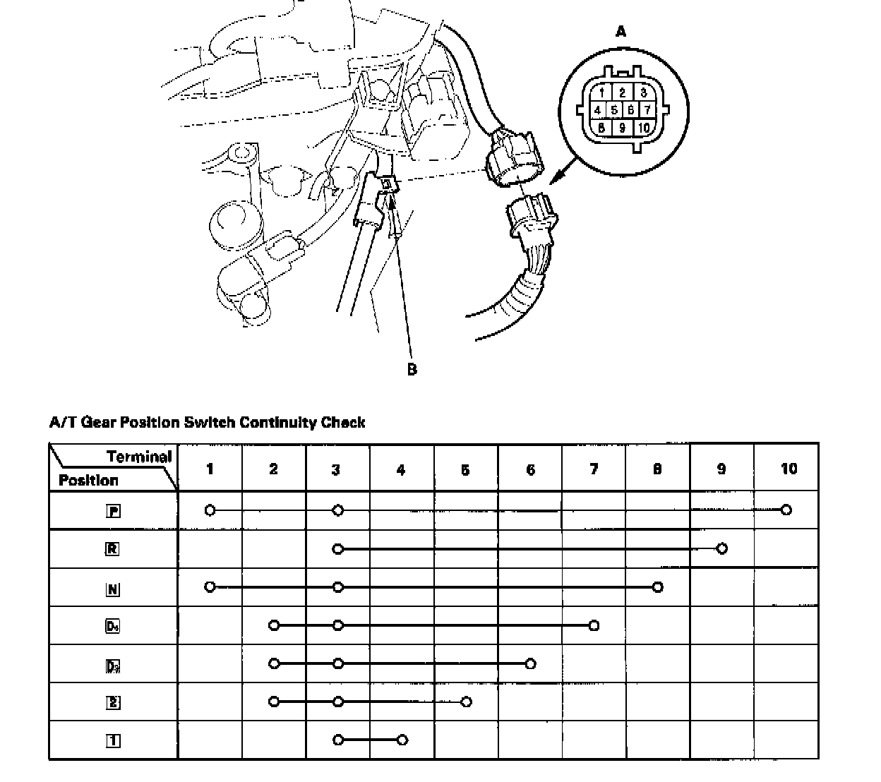 A/T Gear Position - Switch Test1. Remove the A/T gear position switch connector (A) from the connector bracket (B), then disconnect the connector.