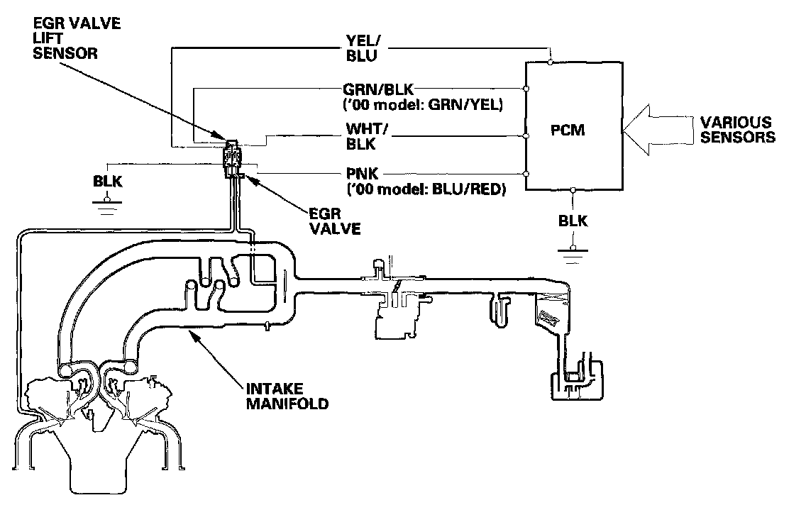 The EGR valve lift sensor detects the amount of EGR valve lift and sends it to the PCM. The PCM then compares it with the ideal lift in its memory (based on signals sent from other sensors). If there is any difference between the two, the PCM cuts current to the EGR valve.