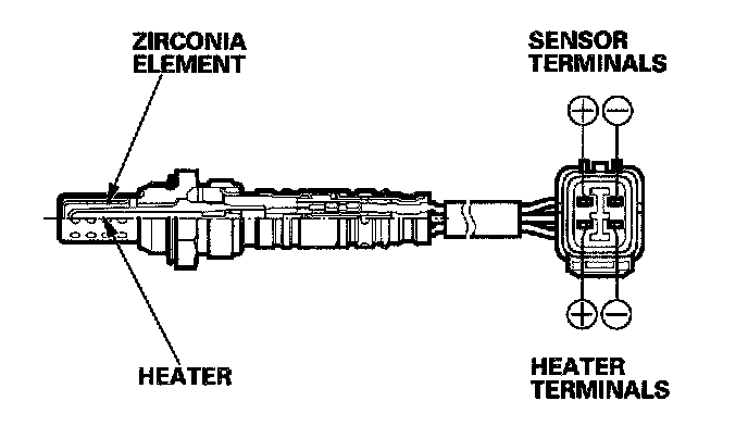 The heated oxygen sensors detect the oxygen content in the exhaust gas, then sends signals to the PCM which varies the duration of fuel injection accordingly. To stabilize its output, the sensors have an internal heater. The primary sensor is installed in the exhaust pipe. The secondary sensor is installed in the TWC.