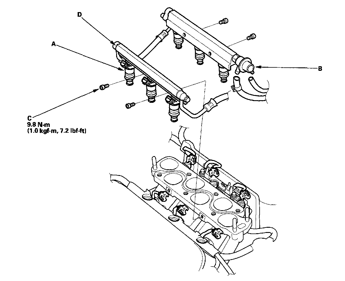 5. Remove the fuel rail bolts (C) from the fuel rail (D).