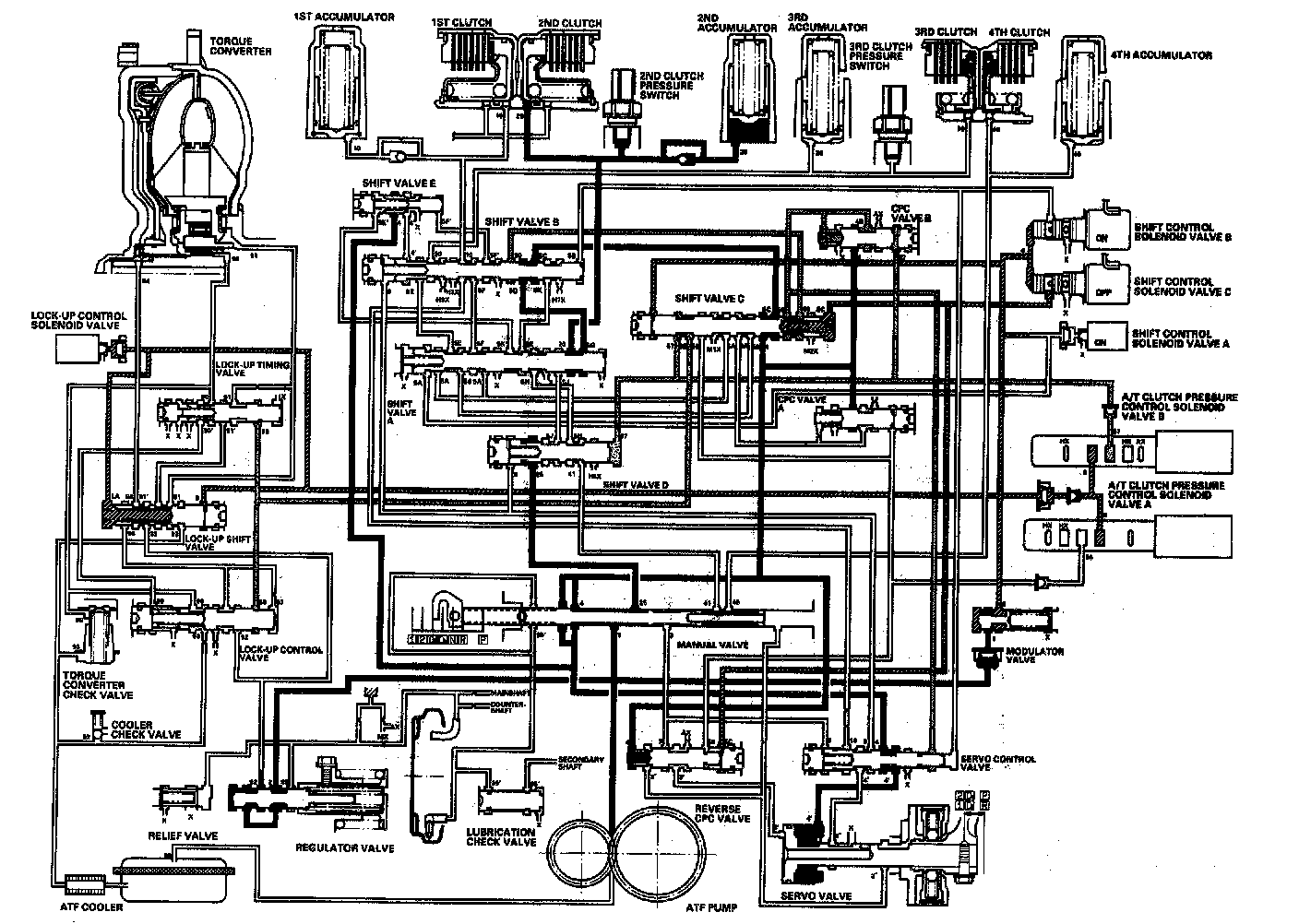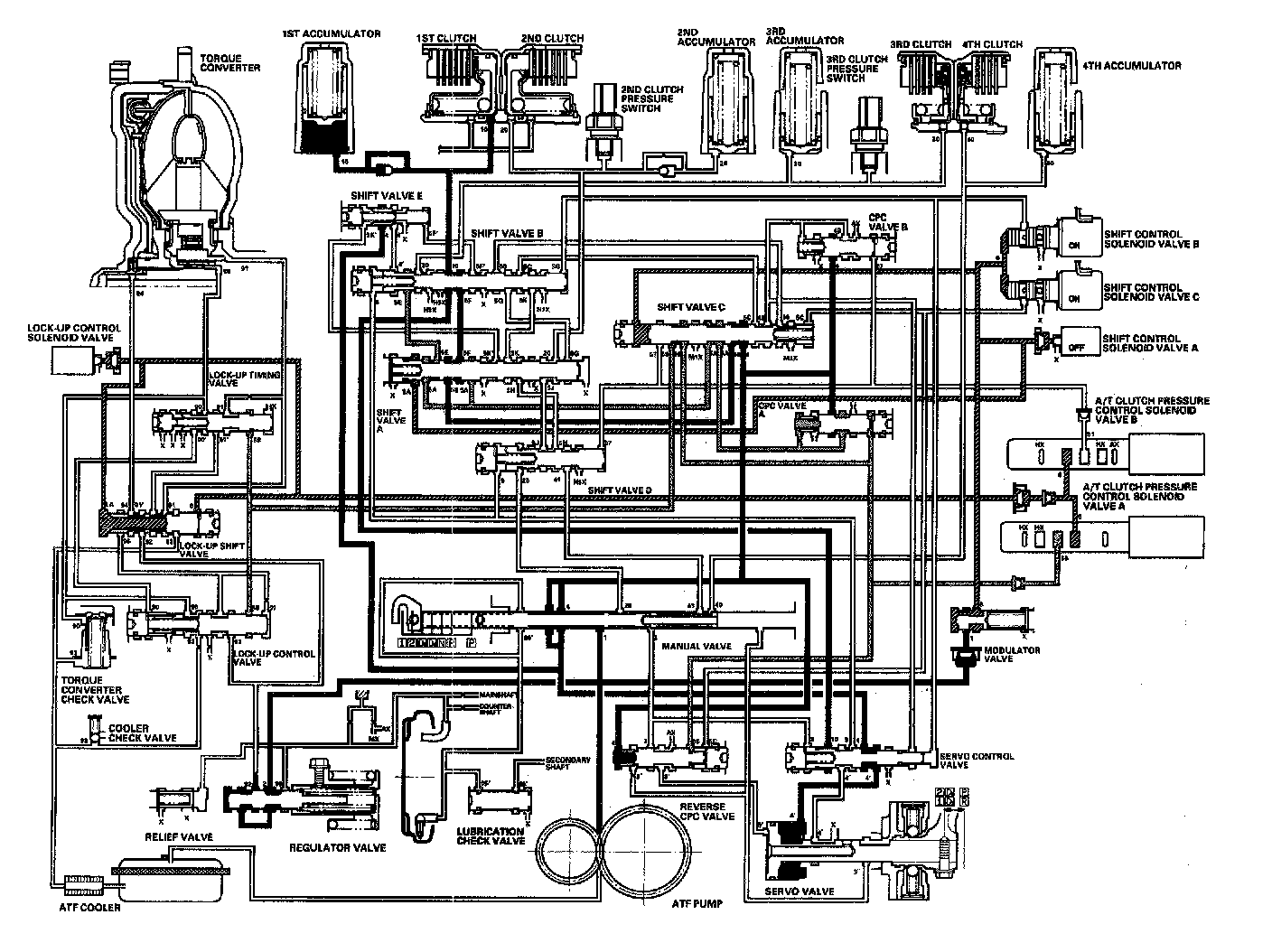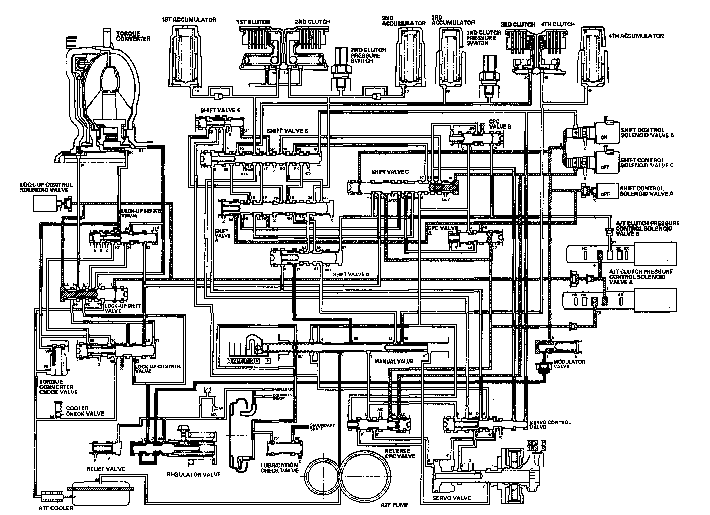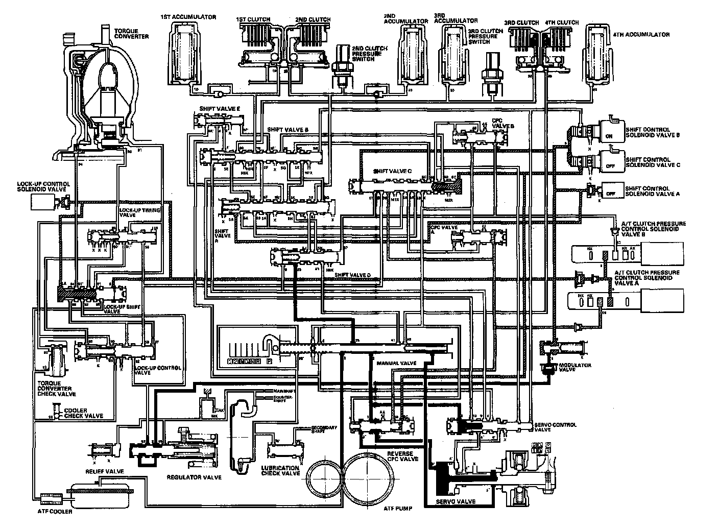Distribution of Hydraulic PressureAs the engine turns, the ATF pump starts to operate. Automatic Transmission Fluid (ATF) is drawn through the ATF strainer (filter) and discharged into the hydraulic circuit. Then, ATF flowing from the ATF pump becomes line pressure that's regulated by the regulator valve. Torque converter pressure from the regulator valve enters the torque converter through the lock-up shift valve and it is discharged from the torque converter. The torque converter check valve prevents torque converter pressure from rising. The PCM controls the shift control solenoid valves ON and OFF, and the shift control solenoid valves control shift solenoid pressure to the shift valves. Applying shift control solenoid pressure to the shift valves moves the position of the shift valve, and switches the port of hydraulic pressure. The PCM also controls A/T clutch pressure control solenoid valves A and B. The A/T clutch pressure control solenoid valves regulate the A/T clutch pressure control solenoid pressure and apply the A/T clutch pressure control solenoid pressure to CPC valves A and B. When shifting between upper gear and lower gear, the clutch, engaged by pressure from the CPC pressure mode.