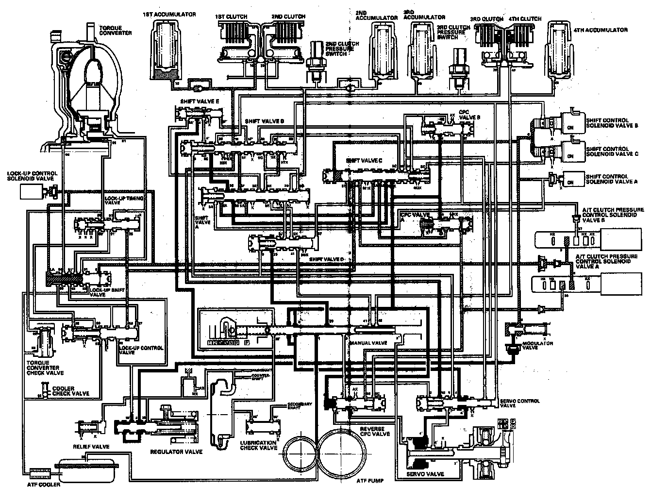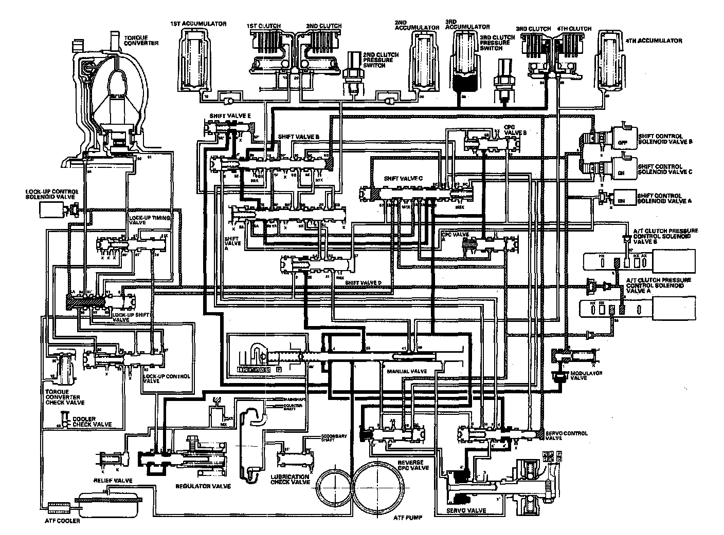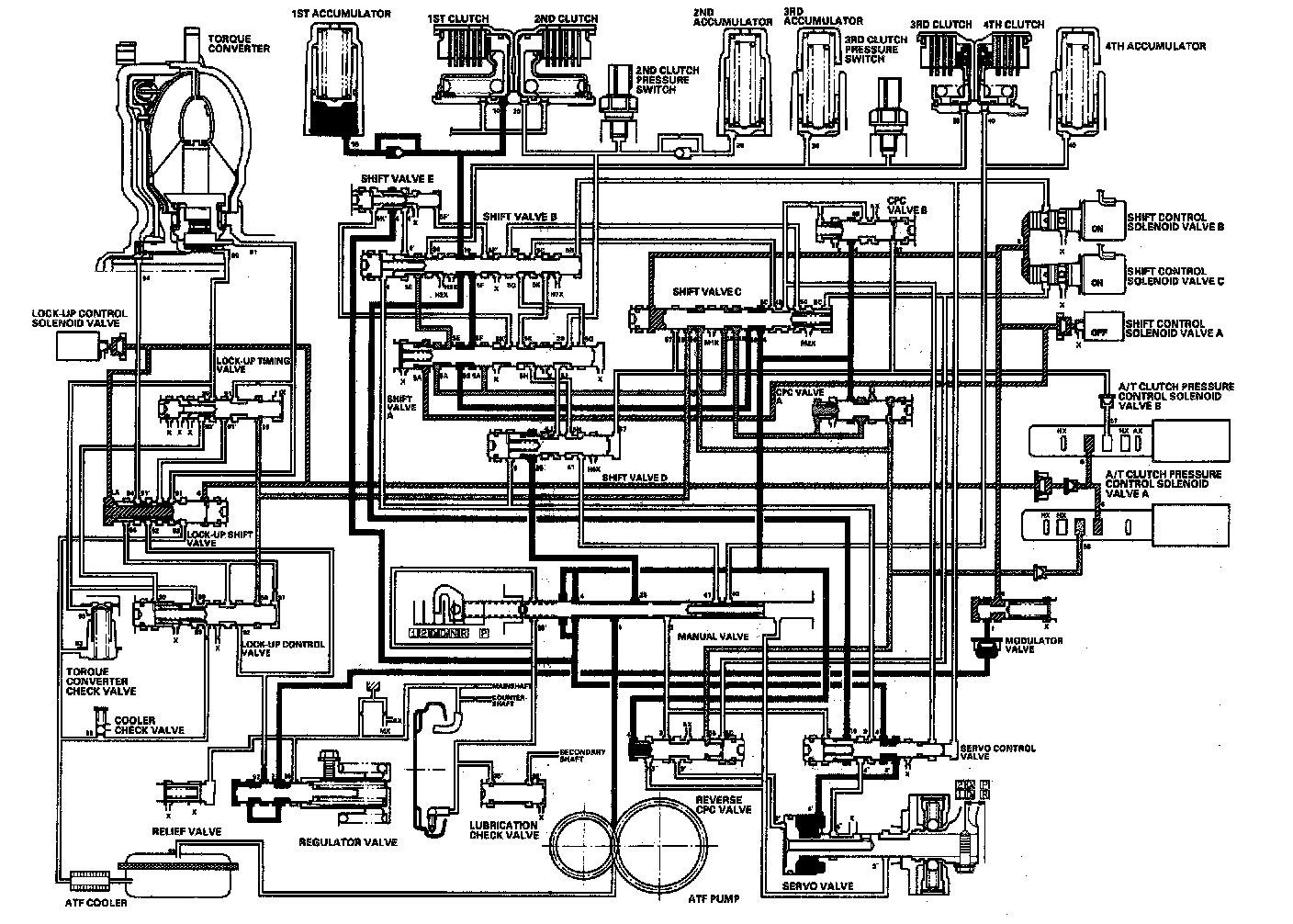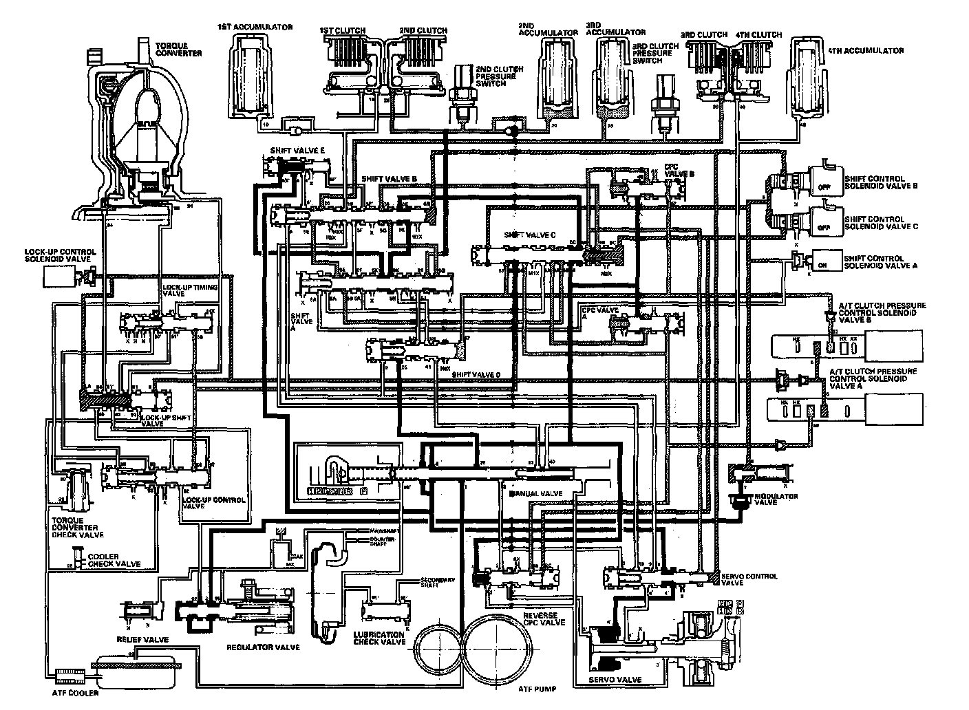Distribution of Hydraulic PressureAs the engine turns, the ATF pump starts to operate. Automatic Transmission Fluid (ATF) is drawn through the ATF strainer (filter) and discharged into the hydraulic circuit. Then, ATF flowing from the ATF pump becomes line pressure that's regulated by the regulator valve. Torque converter pressure from the regulator valve enters the torque converter through the lock-up shift valve and it is discharged from the torque converter. The torque converter check valve prevents torque converter pressure from rising. The PCM controls the shift control solenoid valves ON and OFF, and the shift control solenoid valves control shift solenoid pressure to the shift valves. Applying shift control solenoid pressure to the shift valves moves the position of the shift valve, and switches the port of hydraulic pressure. The PCM also controls A/T clutch pressure control solenoid valves A and B. The A/T clutch pressure control solenoid valves regulate the A/T clutch pressure control solenoid pressure and apply the A/T clutch pressure control solenoid pressure to CPC valves A and B. When shifting between upper gear and lower gear, the clutch, engaged by pressure from the CPC pressure mode.
