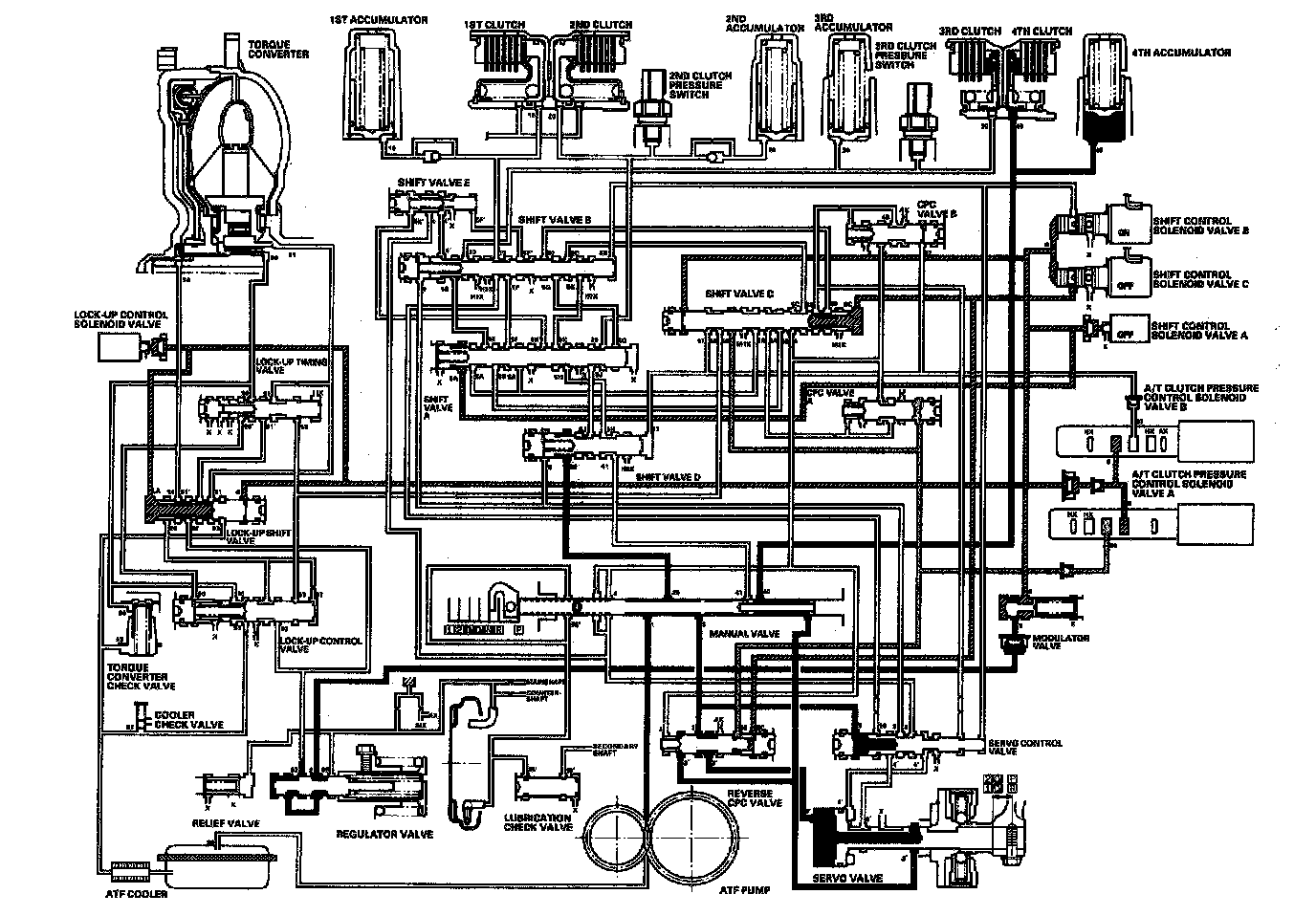 As the speed of the vehicle reaches the prescribed value, the PCM turns shift control solenoid valve A OFF. The PCM also controls A/T clutch pressure control solenoid valve B to apply LS B pressure (57) to CPC valve B. Shift control solenoid valve B remains OFF, and C remains ON. Shift control solenoid valve A is turned OFF, and SH A pressure (SA) is applied to the left side of shift valve A. Then shift valve A is moved to the left side to switch line pressure and CPC pressure. Line pressure (4) becomes CPC B pressure (4B) at CPC valve B. The CPC B pressure (4B) becomes 4th clutch pressure (41) at shift valve D, and Mows to the 4th clutch via the manual valve. The 3rd clutch pressure is changed to CPC pressure mode by switching the position of shift valve A.