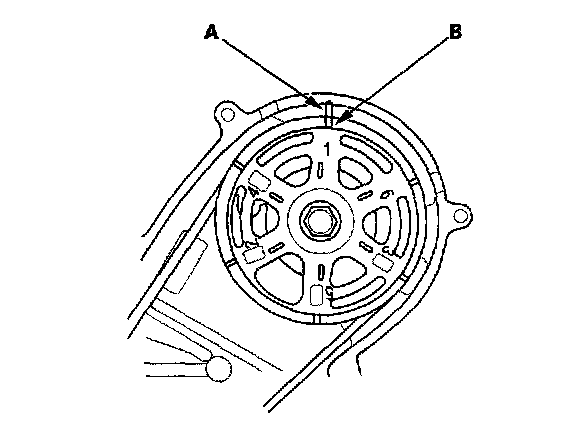 3. Set the No. 1 piston at Top Dead Center (TDC). Align the pointer (A) on the back cover with the No. 1 piston TDC mark (B) on the front camshaft pulley.