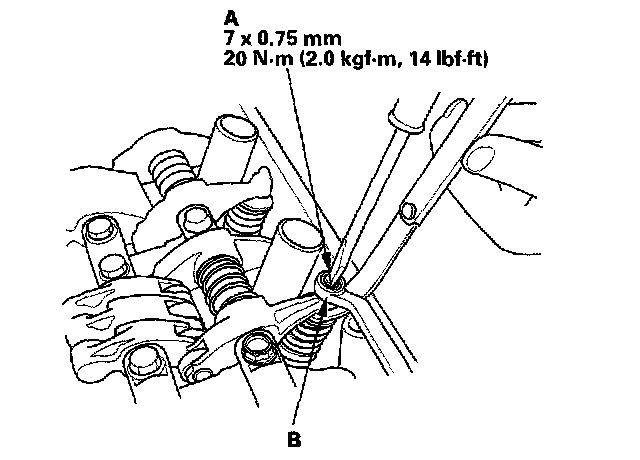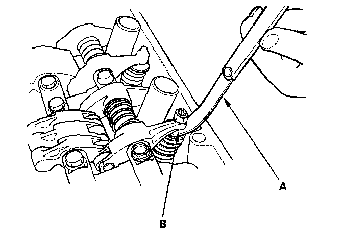 5. Insert the feeler gauge (A) between the adjusting screw (B) and the end of the valve stem and slide it back and forth; you should feel a slight amount of drag.