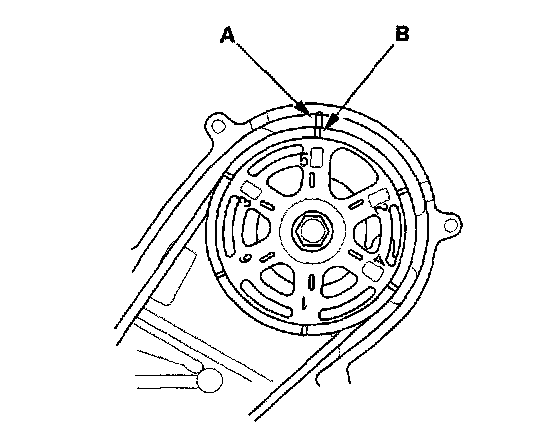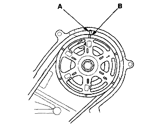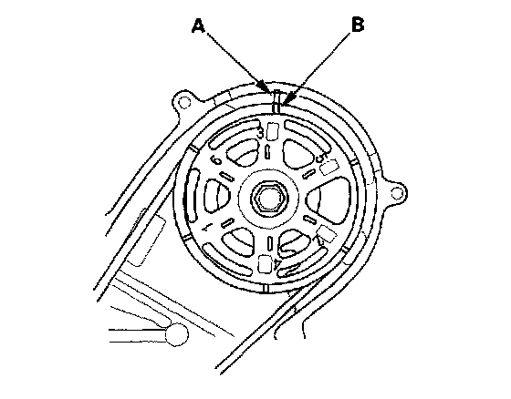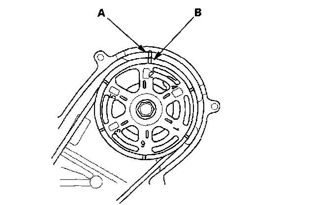 10. Rotate the crankshaft clockwise. Align the pointer (A) on the back cover with the No. 2 piston TDC mark (B) on the front camshaft pulley.