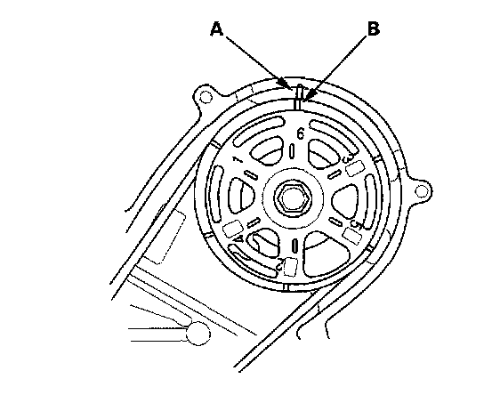 16. Rotate the crankshaft clockwise. Align the pointer (A) on the back cover with the No. 6 piston TDC mark (B) on the front camshaft pulley.
