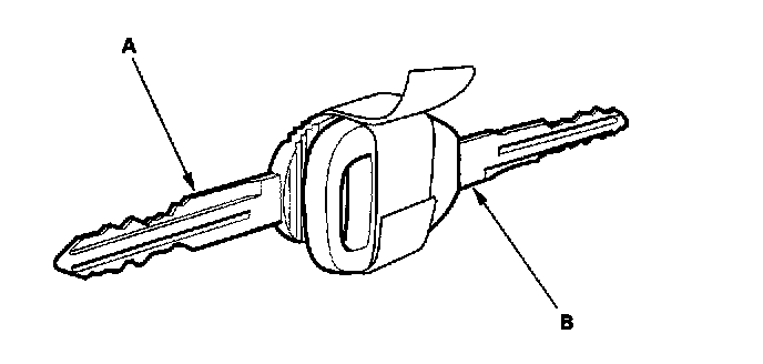 5. Tape the donor vehicle's ignition key head-to-head to the test vehicle's temporary key (A). The PCM will recognize the code from the donor vehicle's key (B) and allow you to start the engine with the temporary key.