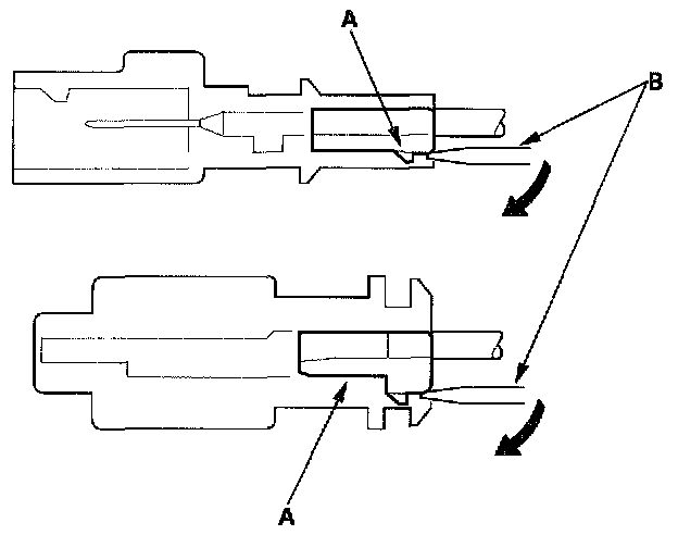 To remove the retainer (A), insert a flat-tip screwdriver (B) between the connector body and the retainer, then carefully pry out the retainer, then carefully pry out the retainer. Take care not to break the connector.