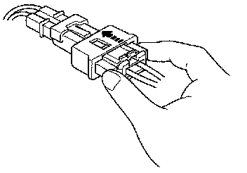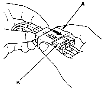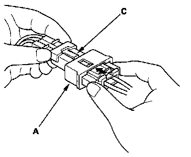 1. To reconnect, hold the pawl-side connector half, and press on the back of the sleeve-side connector half in the direction shown. As the two connector halves are pressed together, the sleeve (A) is pushed back by the paw (C). Do not touch the sleeve.