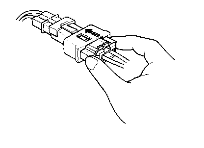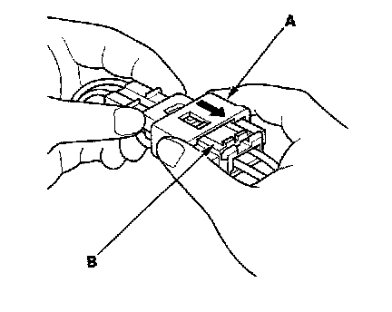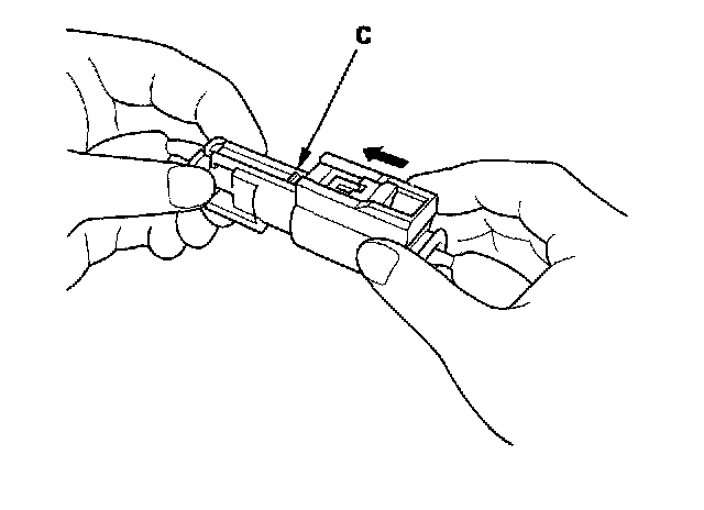 1. To reconnect, hold the pawl-side connector half, and press on the back of the sleeve-side connector half in the direction shown. As the two connector halves are pressed together, the sleeve (A) is pushed back by the pawl (C). Do not touch the sleeve.