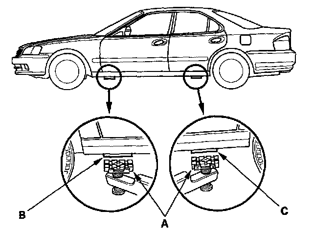 Position the hoist lift blocks (A), or safety stands, under the vehicle's front support points (B) and rear support points (C).