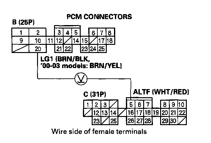7. Measure voltage between PCM connector terminals B20 and C5.