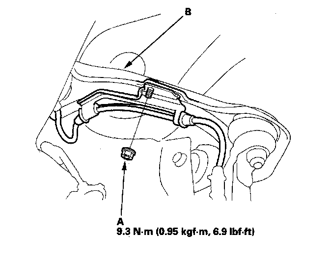 3. Remove the wheel sensor bracket nut (A) from the upper arm (B).