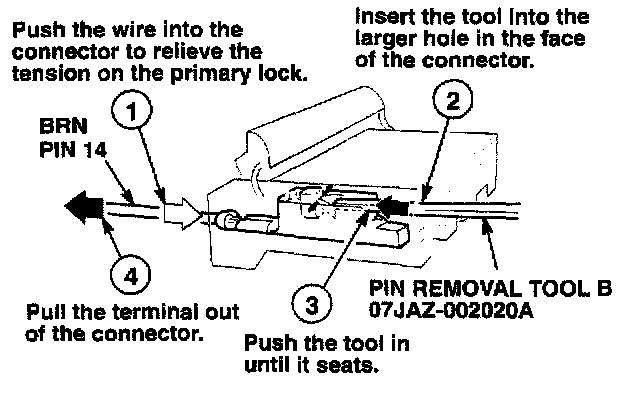 4. Use pin removal tool B to remove pin 14 (BRN wire) from the connector.
