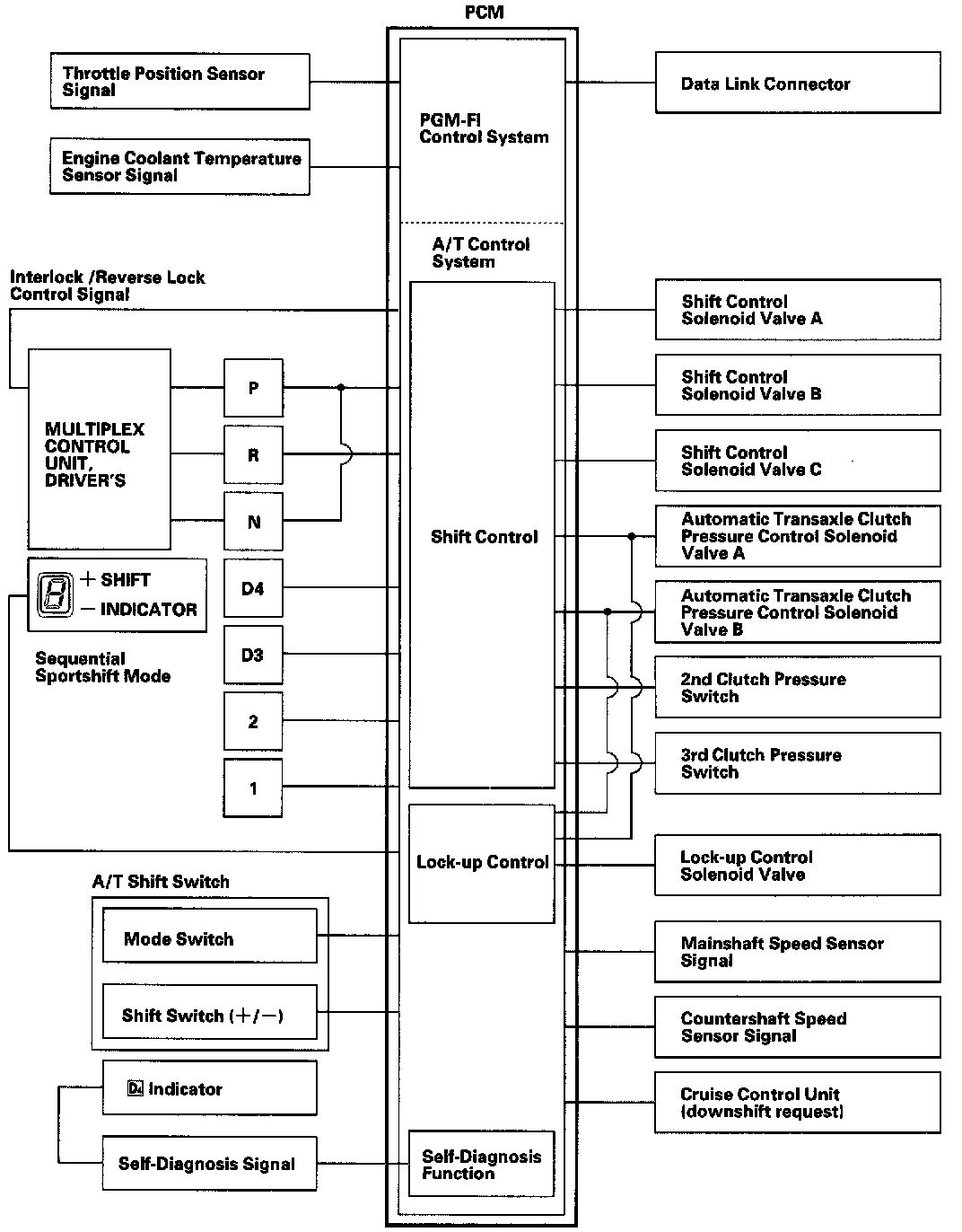 Functional DiagramThe electronic control system consists of the Powertrain Control Module (PCM), sensors, and six solenoid valves. Shifting and lock-up are electronically controlled for comfortable driving under all conditions. The PCM is located below the dashboard, under the front lower panel behind the center console.