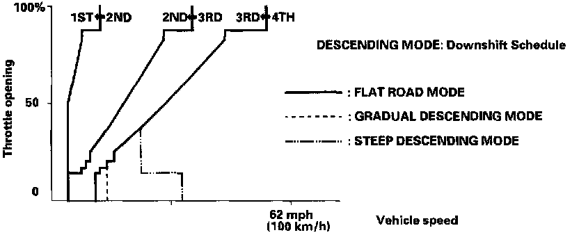 When the PCM determines that the vehicle is going down a hill in [D4] and [D3] positions, the shift-up speed from 3rd to 4th gear and from 2nd to 3rd (when the throttle is closed) becomes faster than the set speed for flat road driving to widen the 3rd gear and 2nd gear driving areas. This, in combination with engine braking from the deceleration lock-up, achieves smooth driving when the vehicle is descending. There are two descending modes with different 3rd gear driving areas and 2nd gear driving areas according to the magnitude of a gradient stored in the PCM. When the vehicle is in 4th gear, and you are decelerating when you are applying the brakes on a steep hill, the transmission will downshift to 3rd gear. When you accelerate, the transmission will then return to higher gear.