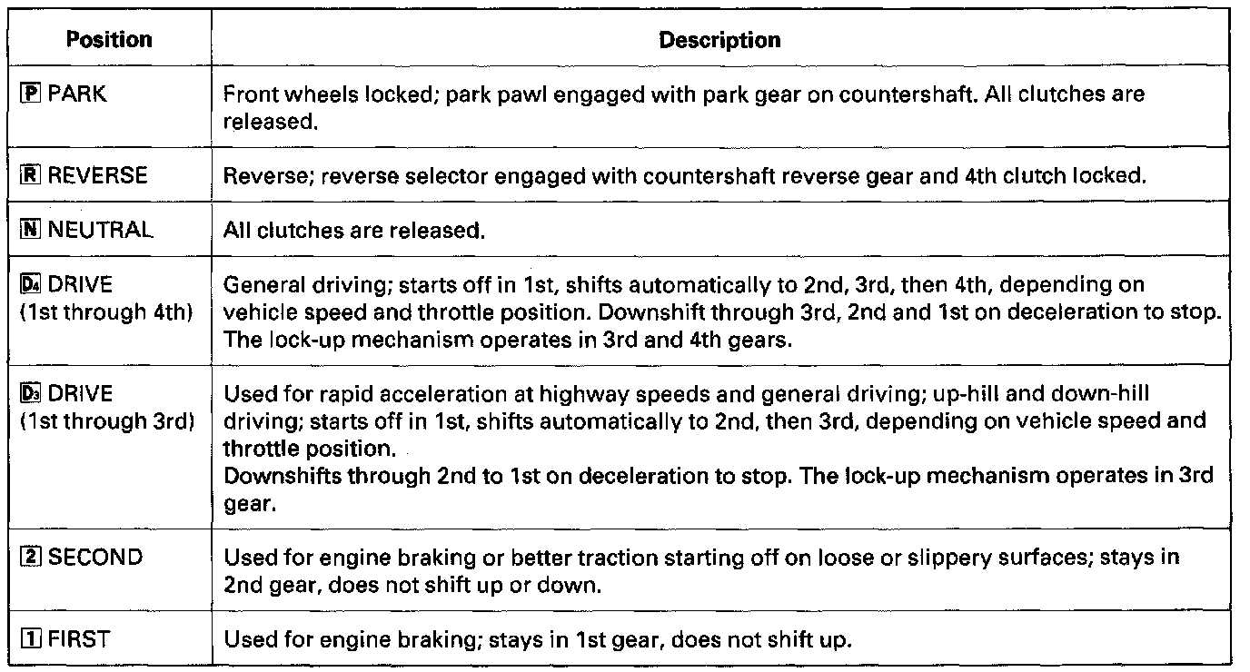 The shift lever has eight positions: [P] PARK, [R] REVERSE, [N] NEUTRAL, [D4] 1st through 4th gear ranges, [D3] 1st through 3rd gear ranges, [2] 2nd gear, [1] 1st gear, and the sequential sport shift mode position.