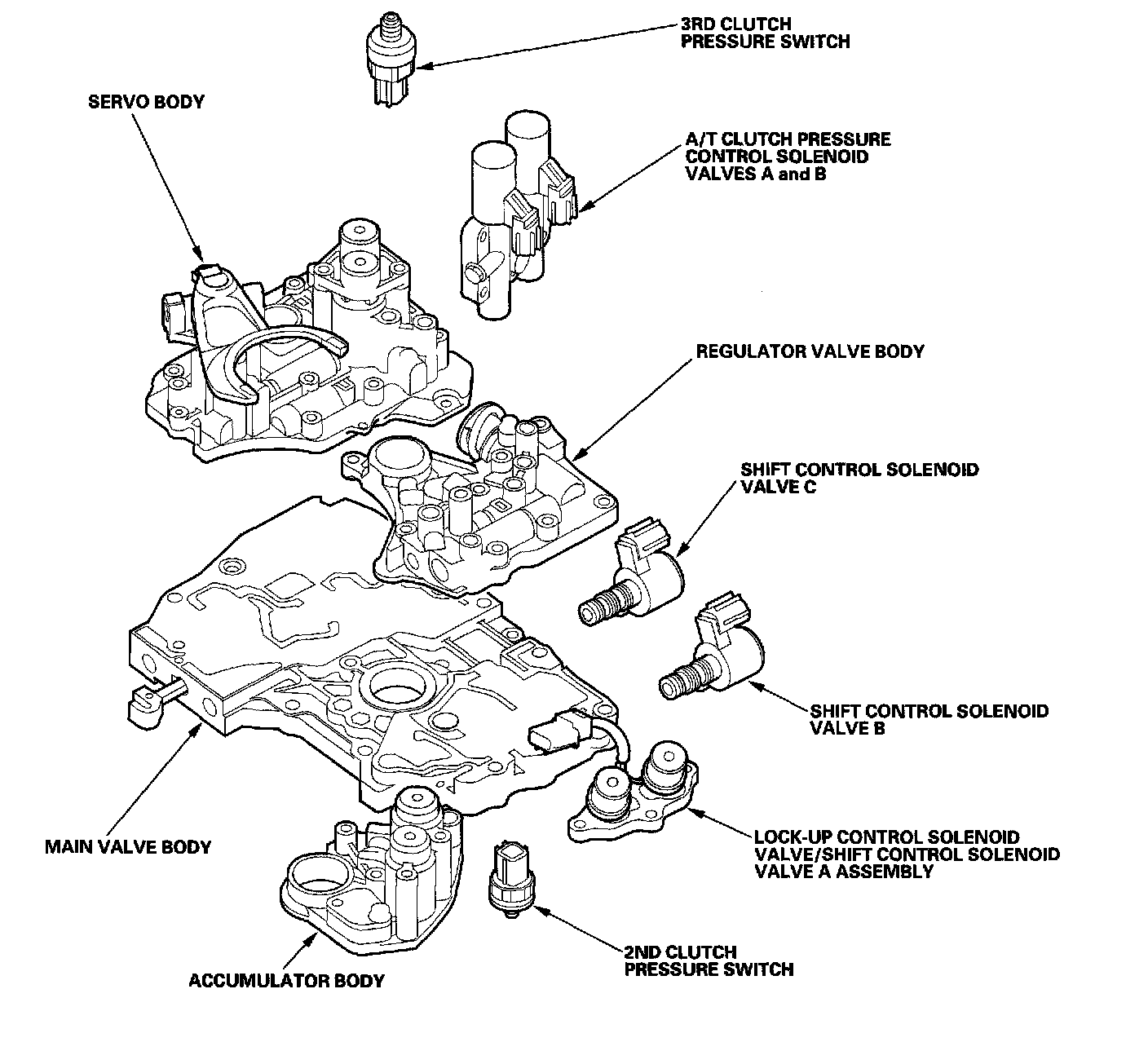 Hydraulic ControlsThe valve body includes the main valve body, the regulator valve body, the servo body and the accumulator body. The ATF pump is driven by splines on the left end of the torque converter which is attached to the engine. Fluid flows through the regulator valve to maintain specified pressure through the main valve body to the manual valve, directing pressure to each of the clutches. The shift control solenoid valves B and C are mounted on the outside of the torque converter housing. The shift control solenoid valve A and the lock-up control solenoid valve are mounted on the torque converter housing as an assembly. The ACT clutch pressure control solenoid valves A and B are mounted on the transmission housing.