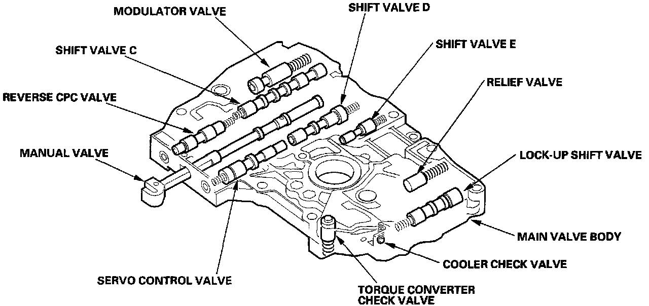 The main valve body contains the manual valve, the modulator valve, the shift valve C, the shift valve D, the shift valve E, the servo control valve, the cooler check valve, the torque converter check valve, the reverse CPC valve, the lock-up shift valve, the relief valve, and the ATF pump gears. The primary function of the main valve body is to switch fluid pressure on and off and to control hydraulic pressure offing to the hydraulic control system.