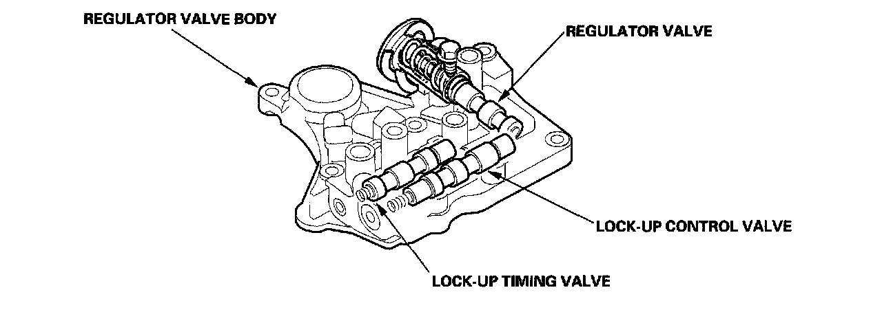 The regulator valve body is located on the main valve body. The regulator valve body contains the regulator valve, the lock-up timing valve, and the lock-up control valve.