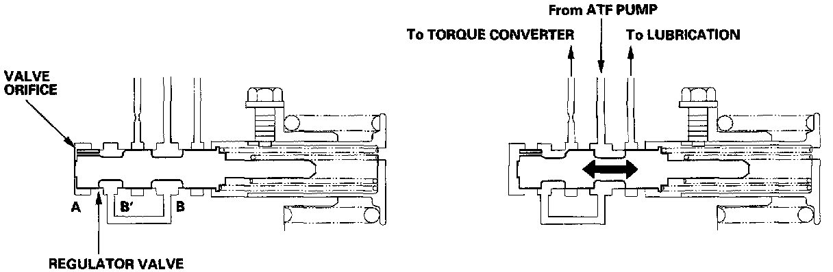 The regulator valve maintains constant hydraulic pressure from the ATF pump to the hydraulic control system, while also furnishing fluid to the lubricating system and torque converter. Fluid from the ATF pump flows through B and B'. Fluid entering from B flows through the valve orifice to the A cavity. This pressure of the A cavity pushes the regulator valve to the right side, and this movement of the regulator valve uncovers the fluid port to the torque converter and the relief valve. The fluid flows out to the torque converter and the relief valve, and the regulator valve moves to the left side. According to the level of the hydraulic pressure through B. the position of the regulator valve changes, and the amount of fluid from B' through torque converter changes. This operation is continued, maintaining the line pressure.