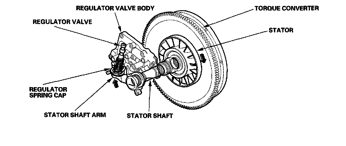 Increases in hydraulic pressure according to torque are performed by the regulator valve using stator torque reaction. The stator shaft is splined with the stator in the torque converter, and its arm end contacts the regulator spring cap. When the vehicle is accelerating or climbing (Torque Converter Range), stator torque reaction acts on the stator shaft, and the stator arm pushes the regulator spring cap in the direction of the arrow in proportion to the reaction. The stator reaction spring compresses, and the regulator valve moves to increase the line pressure which is regulated by the regulator valve. The line pressure reaches its maximum when the stator torque reaction reaches its maximum.
