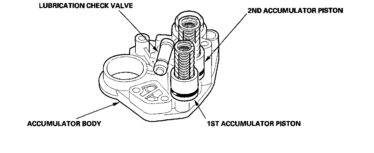 The accumulator body is on the torque converter housing, next to the main valve body. It contains the 1st and the 2nd accumulators, and the lubrication check valve.