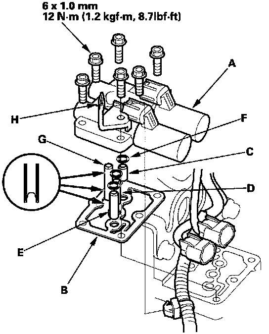 7. Install new O-rings (F) over the feed pipes, and install the 8 x 40 mm ATF feed pipe (G).