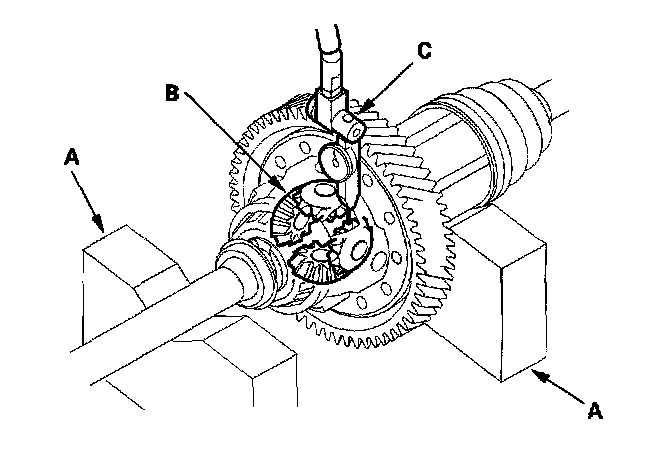 1. Place the differential assembly on V-blocks (A), and install both axles.