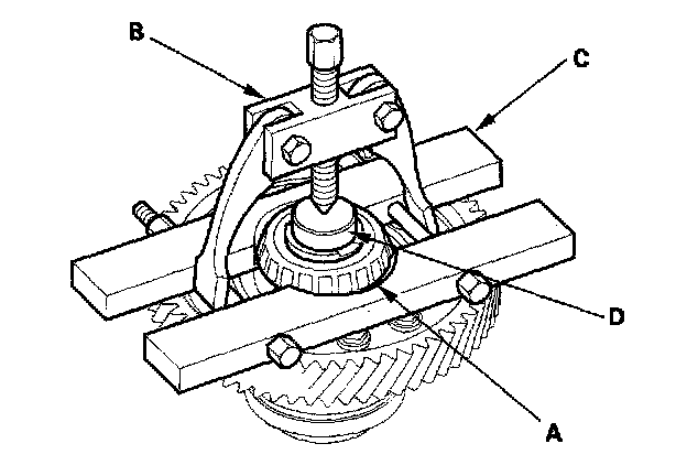1. Remove the carrier bearing (A) with a commercially available bearing puller (B), bearing separator (C), and stepped adapter (D).