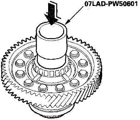 - Use the small end of the special tool to install the bearing. Press the bearings on securely so there is no clearance between the bearings and the differential carrier.