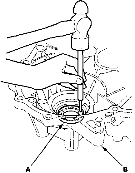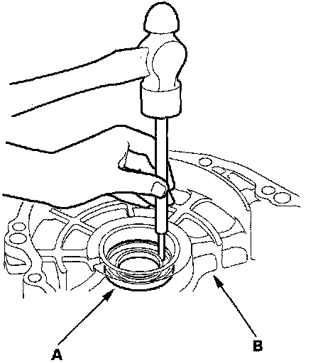 3. Remove the oil seal (A) from the torque converter housing (B).
