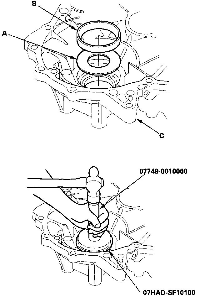 4. Install the thrust washer (A) and outer race (B) in the torque converter housing (C), and use the special tools to make sure the outer race bottoms out in the housing.