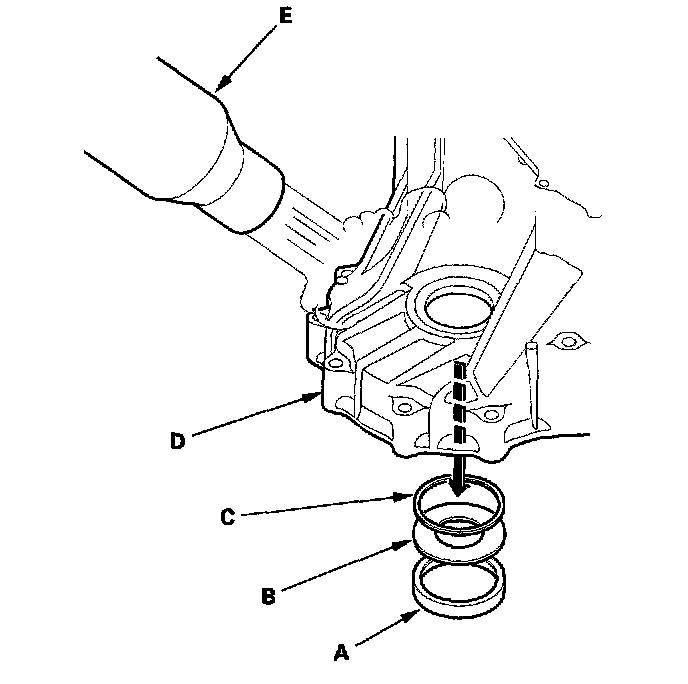 1. Remove the bearing outer race (A), thrust washer (B), and thrust shim (C) from the transmission housing (D) by heating the housing to about 212°F (100°C) with a heat gun (E). Do not treat the housing to more than 212°F (100°C).