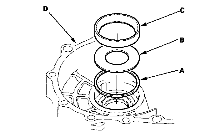 3. Install the thrust shim (A), thrust washer (B), and outer race (C) in the transmission housing (D) with the special tools.
